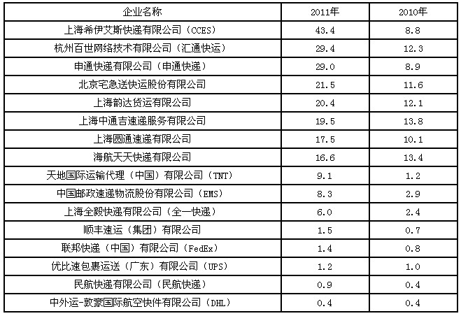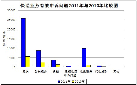 2011年共受理快遞業(yè)務(wù)有效申訴49466件,占全部有效申訴量的97.2%,比2010年增加38315件,增長(zhǎng)343.6%。