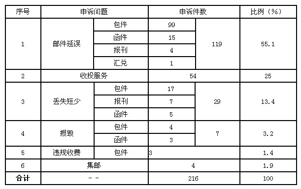 12月,受理消費(fèi)者關(guān)于郵政服務(wù)問(wèn)題的有效申訴216件,比上月增加69件,增長(zhǎng)46.9%。其中,反映郵件延誤的119件,占55.1%;反映收投服務(wù)問(wèn)題的54件,占25%;反映郵件丟失及內(nèi)件短少的29件,占13.4%;反映郵件損毀的7件,占3.2%;反映集郵問(wèn)題的4件,占1.9%;反映違規(guī)收費(fèi)的3件,占1.4%。