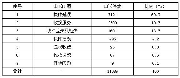 12月,受理消費(fèi)者關(guān)于快遞業(yè)務(wù)的有效申訴11689件,比上月增加4417件,增長(zhǎng)60.7%。其中,反映快件延誤的7121件,占60.9%;反映收投服務(wù)問(wèn)題的2300件,占19.7%;反映快件丟失及內(nèi)件短少的1601件,占13.7%;反映快件損毀的496件,占4.2%;反映違規(guī)收費(fèi)的95件,占0.8%;反映代收貨款問(wèn)題的67件,占0.6%;反映其他問(wèn)題的9件,占0.1%。