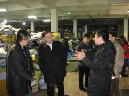元月10日深夜,剛下飛機(jī)的國家郵政局馬軍勝局長不顧貴州高原還正下著特有的凍雨,在貴州省郵政管理局徐文葛局長的陪同下,趕往快遞企業(yè)中轉(zhuǎn)場(chǎng)地,調(diào)研和檢查正值旺季高峰的快遞服務(wù)工作。