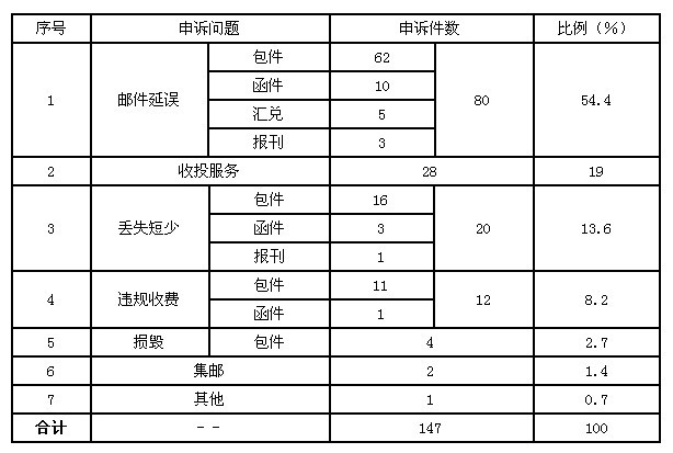 11月,受理消費(fèi)者關(guān)于郵政服務(wù)問題的有效申訴147件,比上月減少12件,下降7.6%。其中,反映郵件延誤的80件,占54.4%;反映收投服務(wù)問題的28件,占19%;反映郵件丟失及內(nèi)件短少的20件,占13.6%;反映違規(guī)收費(fèi)的12件,占8.2%;反映郵件損毀的4件,占2.7%;反映集郵問題的2件,占1.4%;反映其他問題的1件,占0.7%。