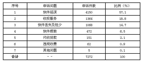 11月,受理消費(fèi)者關(guān)于快遞業(yè)務(wù)的有效申訴7272件。比上月增加2633件,增長56.8%。其中,反映快件延誤的4150件,占57.1%;反映收投服務(wù)問題的1364件,占18.8%;反映快件丟失及內(nèi)件短少的1068件,占14.7%;反映快件損毀的472件,占6.5%;反映代收貨款問題的151件,占2.1%;反映違規(guī)收費(fèi)的62件,占0.9%;反映其他問題的5件,占0.1%。