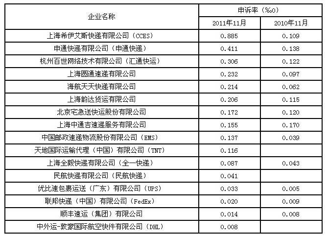 主要快遞企業(yè)申訴率2011年11月與2010年11月比較統(tǒng)計(jì)表