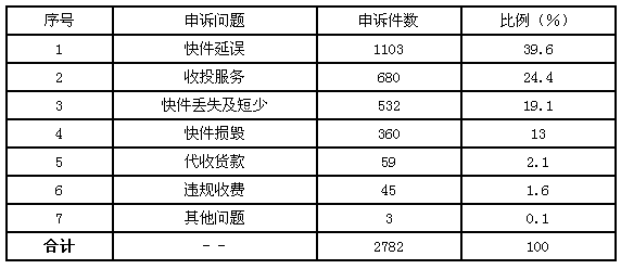 8月,受理消費(fèi)者關(guān)于快遞業(yè)務(wù)的有效申訴2782件。比上月增加304件,增長(zhǎng)12.3%。其中,反映快件延誤的1103件,占39.6%;反映收投服務(wù)問(wèn)題的680件,占24.4%;反映快件丟失及內(nèi)件短少的532件,占19.1%;反映快件損毀的360件,占13%;反映代收貨款問(wèn)題的59件,占2.1%;反映違規(guī)收費(fèi)的45件,占1.6%;反映其他問(wèn)題的3件,占0.1%。