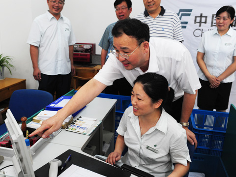 圖為馬軍勝局長仔細(xì)了解郵政支局代辦民航機票業(yè)務(wù)的情況。