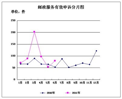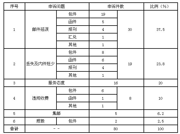 6月,受理消費者關(guān)于郵政服務(wù)問題的有效申訴80件,比上月增加27件,增長50.9%。其中,反映郵件延誤的30件,占37.5%;反映郵件丟失及內(nèi)件短少的19件,占23.8%;反映服務(wù)態(tài)度差的16件,占20%;反映違規(guī)收費的8件,占10%;反映集郵問題的5件,占6.2%;反映郵件損毀的2件,占2.5%。