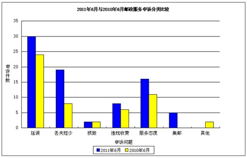 6月消費者對郵政服務(wù)申訴的主要問題是郵件延誤和郵件丟失及內(nèi)件短少,分別比上月增長15.4%和111.1%,占郵政服務(wù)有效申訴量的61.3%。