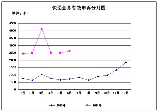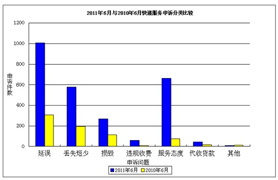 6月,受理消費者關(guān)于快遞業(yè)務(wù)的有效申訴2633件。比上月增加136件,增長5.5%。其中,反映快件延誤的1009件,占38.3%;反映服務(wù)態(tài)度差的662件,占25.1%;反映快件丟失及內(nèi)件短少的579件,占22%;反映快件損毀的269件,占10.2%;反映違規(guī)收費的60件,占2.3%;反映代收貨款問題的45件,占1.7%;反映其他問題的9件,占0.3 %。