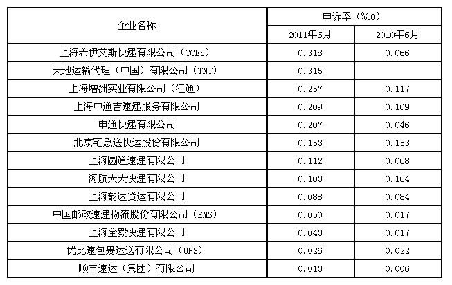 主要快遞企業(yè)申訴率2011年6月與2010年6月比較統(tǒng)計表