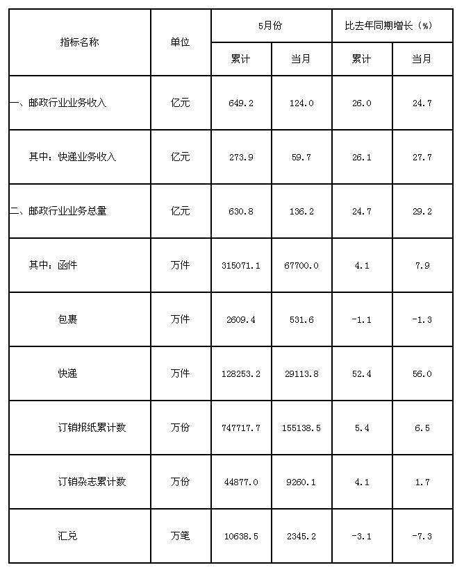 1-5月,郵政函件業(yè)務累計完成31.5億件,同比增長4.1%;包裹業(yè)務累計完成2609.4萬件,同比下降1.1%;報紙業(yè)務累計完成74.8億份,同比增長5.4%;雜志業(yè)務累計完成4.5億份,同比增長4.1%;匯兌業(yè)務累計完成1.1億筆,同比下降3.1%。