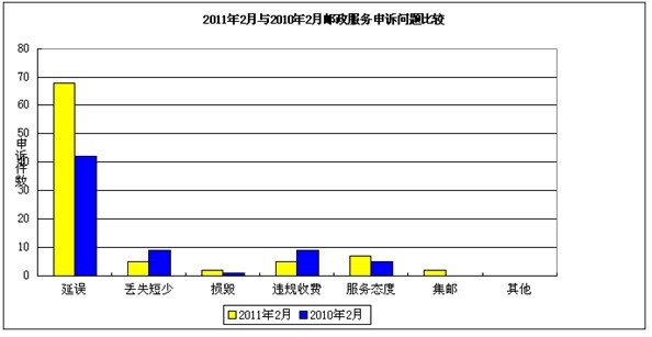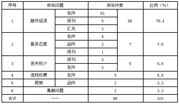 2月,受理消費者關于郵政服務問題的有效申訴89件,同比增加24件,增長36.9%。比上月增加18件,增長25.4%。其中,反映郵件延誤的68件,占76.4%;反映服務態(tài)度差的7件,占7.9%;反映郵件丟失及內(nèi)件短少的5件,占5.6%;反映違規(guī)收費的5件,占5.6%;反映郵件損毀的2件,占2.2%;反映集郵問題的2件,占2.2%。