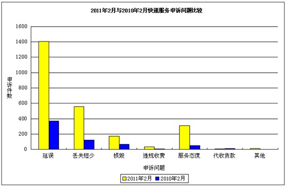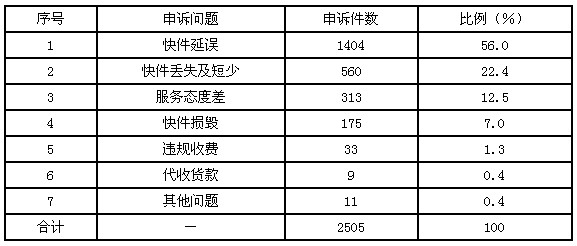 2月,受理消費者關于快遞業(yè)務的有效申訴2505件,同比增加1871件,增長295.1%。比上月增加55件,增長2.2%。其中,反映快件延誤的1404件,占56%;反映快件丟失及內(nèi)件短少的560件,占22.4%;反映服務態(tài)度差的313件,占12.5%;反映快件損毀的175件,占7%;反映違規(guī)收費的33件,占1.3%;反映代收貨款問題的9件,占0.4%;反映其他問題的11件,占0.4%。