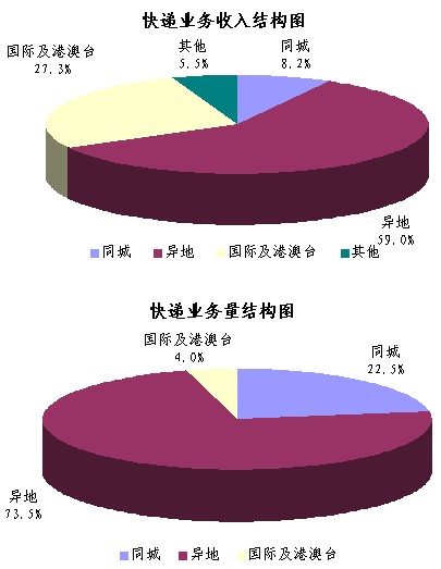 全國規(guī)模以上快遞服務企業(yè)業(yè)務量累計完成4.2億件,同比增長50.6%;業(yè)務收入累計完成94.7億元,同比增長22.9%。其中,同城業(yè)務收入累計完成7.7億元,同比增長55.3%;異地業(yè)務收入累計完成55.9億元,同比增長32.6%;國際及港澳臺業(yè)務收入累計完成25.8億元,同比增長2.5%。