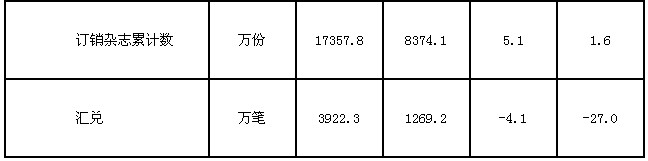 郵政函件業(yè)務累計完成11.4億件,同比增長4.3%;報紙業(yè)務累計完成28.4億份,同比增長5.2%;雜志業(yè)務累計完成1.7億份,同比增長5.1%;匯兌業(yè)務累計完成3922.3萬筆,同比下降4.1%。
