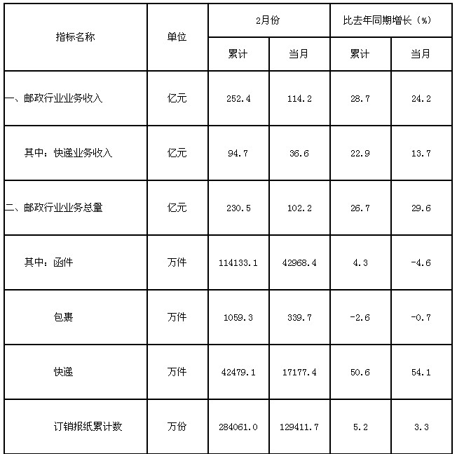 國家郵政局:1至2月郵政行業(yè)業(yè)務收入同比增長28.7%