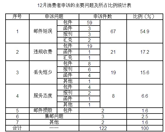 12月,受理消費者關(guān)于郵政服務(wù)問題的有效申訴122件,比上月增加58件,增長90.6%。比上年同期增加36件,增長41.9%。其中,反映郵件延誤的67件,占54.9%;反映違規(guī)收費的21件,占17.2%;反映郵件丟失及內(nèi)件短少的19件,占15.6%;反映服務(wù)態(tài)度差的8件,占6.6%;反映集郵問題的3件,占2.5%;反映郵件損毀問題的2件,占1.6%。反映其他問題的2件,占1.6%。