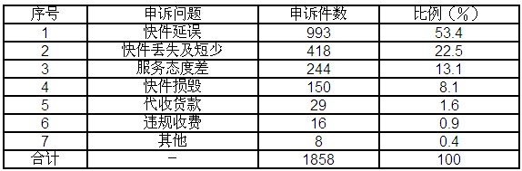 12月,受理消費者關(guān)于快遞業(yè)務(wù)的有效申訴1858件,比上月增加514件,增長38.2%。比上年同期增加1081件,增長139.1%。其中,反映快件延誤的993件,占53.4%;反映快件丟失及內(nèi)件短少的418件,占22.5%;反映服務(wù)態(tài)度差的244件,占13.1%;反映快件損毀的150件,占8.1%;反映代收貨款問題的29件,占1.6%;反映違規(guī)收費的16件,占0.9%;反映其他問題的8件,占0.4%。