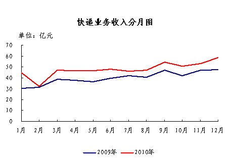 2010年,全國規(guī)模以上快遞服務(wù)企業(yè)業(yè)務(wù)量累計(jì)完成23.4億件,同比增長25.9%;業(yè)務(wù)收入累計(jì)完成574.6億元,同比增長20.0%。