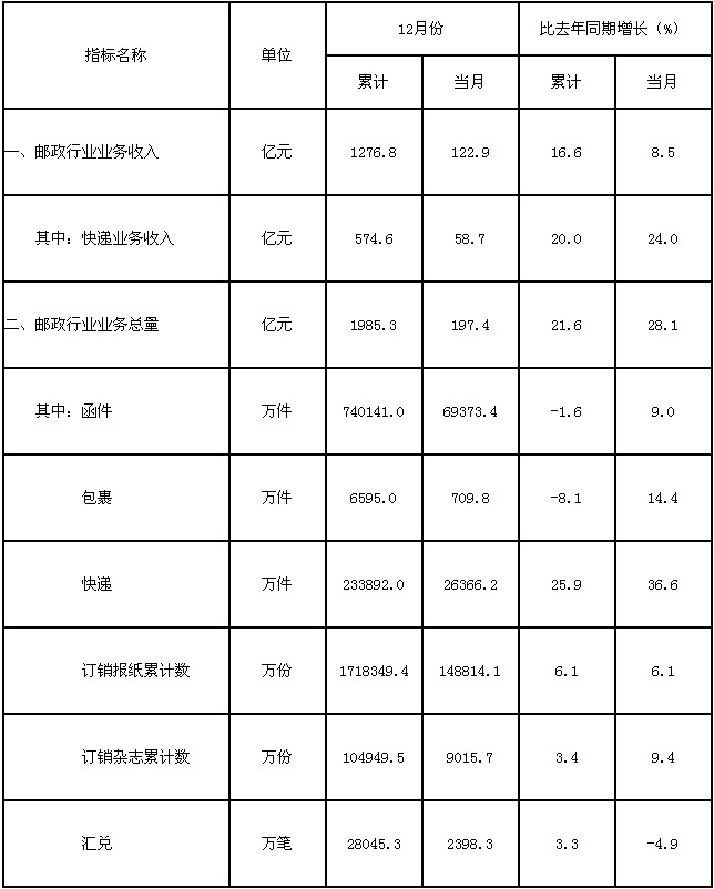 12月份當(dāng)月,快遞業(yè)務(wù)量完成2.6億件,同比增長36.6%;業(yè)務(wù)收入完成58.7億元,同比增長24%。