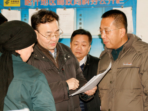 圖為馬軍勝局長(zhǎng)視察喀什郵區(qū)中心局。