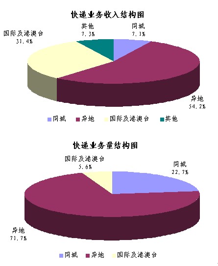 2010年1-10月,同城、異地、國際及港澳臺快遞業(yè)務(wù)收入分別占全部快遞收入的7.1%、54.2%和31.4%;業(yè)務(wù)量分別占全部快遞業(yè)務(wù)量的22.7%、71.7%和5.6%。