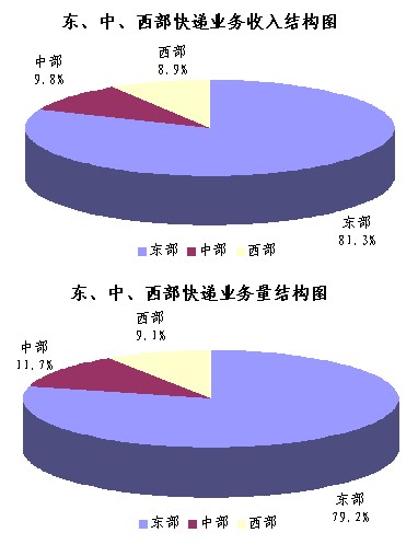 2010年1-10月,東、中、西部地區(qū)快遞業(yè)務(wù)收入的比重分別為81.3%、9.8%和8.9%,業(yè)務(wù)量比重分別為79.2%、11.7%和9.1%。