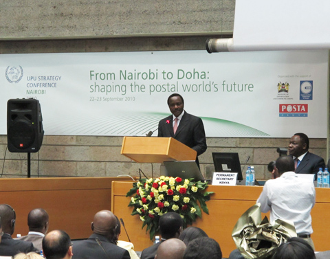 2010年9月22日至23日,萬國郵聯(lián)郵政戰(zhàn)略大會在肯尼亞內(nèi)羅畢聯(lián)合國國際會議中心舉行,肯尼亞副總統(tǒng)Stephen Kalonzo Musyoka出席開幕式并致辭。本次會議邀請了各成員國政府、國際組織的高級官員和郵政企業(yè)負(fù)責(zé)人600余人參加。代表們深入探討當(dāng)今郵政面臨的環(huán)境,共商郵政發(fā)展大計。馬軍勝局長率中國代表團出席了會議,并在大會上做了主題發(fā)言。