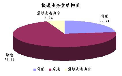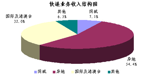 2010年1-8月,同城、異地、國際及港澳臺快遞業(yè)務(wù)收入分別占全部快遞收入的7.1%、54.4%和32.0%;業(yè)務(wù)量分別占全部快遞業(yè)務(wù)量的22.7%、71.6%和5.7%。
