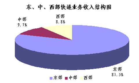 2010年1-8月,東、中、西部地區(qū)快遞業(yè)務(wù)收入的比重分別為81.5%、9.7%和8.8%,業(yè)務(wù)量比重分別為79.1%、11.8%和9.1%。