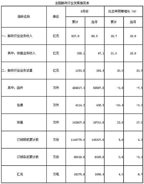 8月份當月,快遞業(yè)務(wù)量完成2億件,同比增長17%;業(yè)務(wù)收入完成47.1億元,同比增長16.9%。