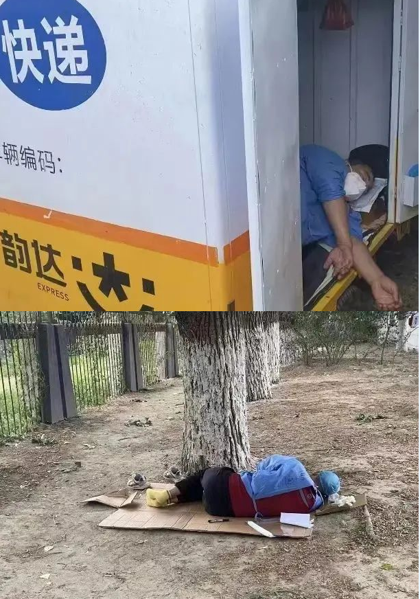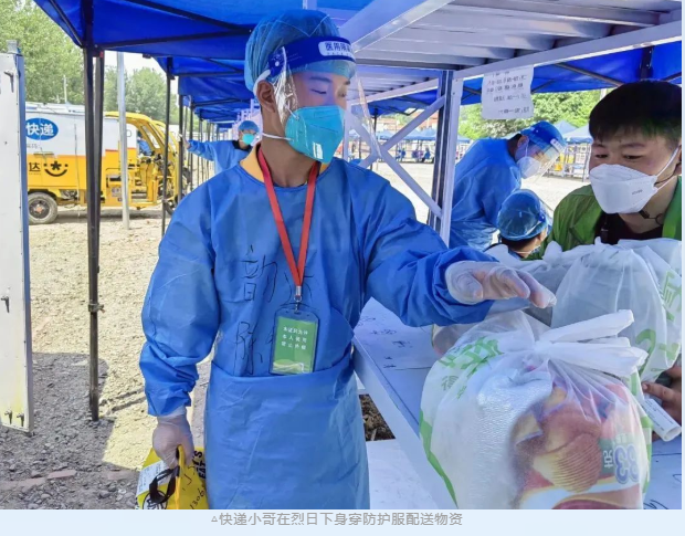 這期間,北京迎來入夏以來的最高溫,快遞小哥們經(jīng)常大汗淋漓、防護(hù)手套中浸滿汗水,有的小哥手被泡腫,有的小哥嗓子上火,還有的小哥高溫中暑,但他們毫無怨言,仍然堅守工作,連續(xù)奮戰(zhàn)。韻達(dá)快遞的一位小哥家人去世,強忍悲痛,堅守一線為居民配送物資。由于道路顛簸,車輛經(jīng)常出現(xiàn)故障,為搶時間爭速度,小哥們等不及維修師傅到場,就自行修換輪胎,保證能將居民的生活物資及時送達(dá)。為了節(jié)省時間,大家的一日三餐都是在防疫現(xiàn)場輪流解決,忙完高峰期后短暫地躺在地上、三輪車上小休。在快遞小哥支援后第一天,市民熱線投訴數(shù)量就由最初的280件下降到40件,其中還有表揚來電。