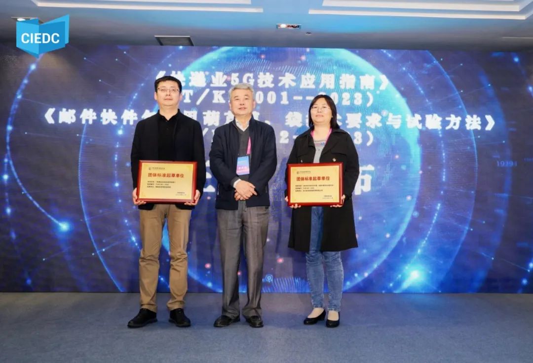 會議還進行了團體標準的發(fā)布儀式。與會專家和代表一起見證了《快遞業(yè)5G技術應用指南》,《郵件快件包裝用葫蘆膜、袋技術要求與試驗方法》全國團體標準的發(fā)布。中國快遞協(xié)會副秘書長楊駿,分別為兩項團標的第一起草單位郵政科學研究規(guī)劃院,浙江菜鳥供應鏈管理有限公司的代表授牌。