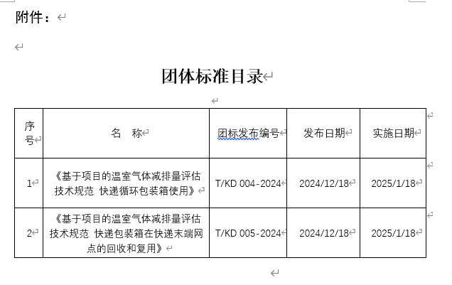 根據(jù)《中國(guó)快遞協(xié)會(huì)團(tuán)體標(biāo)準(zhǔn)管理辦法》的相關(guān)要求,《基于項(xiàng)目的溫室氣體減排量評(píng)估技術(shù)規(guī)范 快遞循環(huán)包裝箱使用》《基于項(xiàng)目的溫室氣體減排量評(píng)估技術(shù)規(guī)范 快遞包裝箱在快遞末端網(wǎng)點(diǎn)的回收和復(fù)用》兩項(xiàng)團(tuán)體標(biāo)準(zhǔn)按照規(guī)定程序編制,經(jīng)常務(wù)理事會(huì)審議通過,現(xiàn)予以正式發(fā)布,自2025年1月18日起施行。