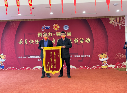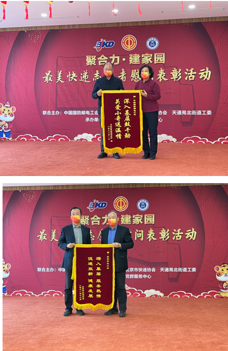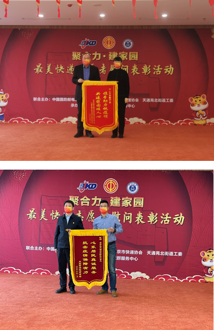 儀式上,劉迎祥主席代表中國國防郵電工會向順豐快遞員金亮等15名快遞小哥每人頒發(fā)了1000元慰問金。北京市總工會服務(wù)工會孫宇主席、昌平區(qū)總工會王冰主席、天通苑北街道工委李剛書記和北京市快遞協(xié)會領(lǐng)導(dǎo)一起向快遞小哥頒發(fā)了“最美快遞志愿者’榮譽證書”和慰問品,以表彰他們在天通苑疫情期間化身志愿者堅守工作崗位,為打贏抗疫之戰(zhàn)所作出的突出貢獻。京東配送員彭東方作為15名榮獲“最美快遞志愿者’的快遞小哥表示,感謝工會領(lǐng)導(dǎo)、快遞協(xié)會和天北街道領(lǐng)導(dǎo)對我們的關(guān)心關(guān)愛,疫情爆發(fā)初期我們都很緊張,快遞協(xié)會主動聯(lián)系我們解決困難,協(xié)會領(lǐng)導(dǎo)不僅到現(xiàn)場給我們送來了水壺、防寒衣物等物品,還專門為我們這些小哥譜寫了《快遞之歌》,鼓舞了士氣,振奮了人心。天北街道組織我們滯留小區(qū)內(nèi)的15名快遞員成為小區(qū)疫情防控志愿者,千方百計幫我們協(xié)調(diào)解決了住宿和吃飯問題,雖然當(dāng)時每個人每天配送米、面、油、水、蔬菜等生活必需品的重量要超過1000斤,很累很辛苦,但每當(dāng)看到居民感激的笑臉,就覺得我們所有的付出都值了。今后再遇到此類情況依然會迎難而上,決不辜負(fù)領(lǐng)導(dǎo)的期望。為感謝疫情防控期間對小哥的呵護與照顧,順豐和京東兩家企業(yè)代表志愿者團隊分別向北京市快遞協(xié)會和天北街道贈送了錦旗表示感謝。