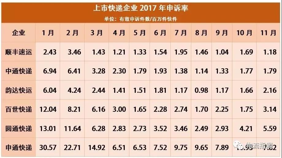 在最受關(guān)注的主要快遞企業(yè)有效申訴率中,國通、全峰等中小快遞企業(yè)依舊“霸占”申訴榜的前列,順豐依舊穩(wěn)定,而其他上市企業(yè)則表現(xiàn)各異。