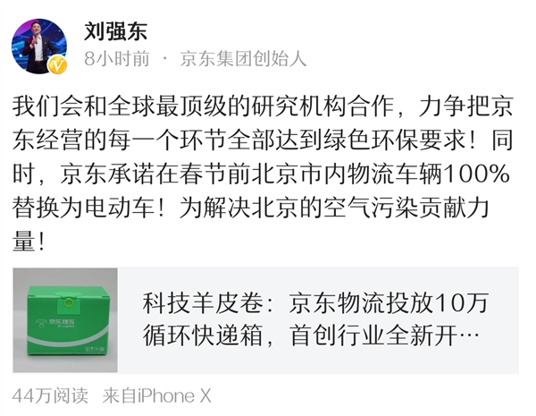 除此之外,劉強(qiáng)東表示“我們會(huì)和全球最頂級(jí)的研究機(jī)構(gòu)合作,力爭把京東經(jīng)營的每一個(gè)環(huán)節(jié)全部達(dá)到綠色環(huán)保要求!同時(shí),京東承諾在春節(jié)前北京市內(nèi)物流車輛100%替換為電動(dòng)車!為解決北京的空氣污染貢獻(xiàn)力量!”