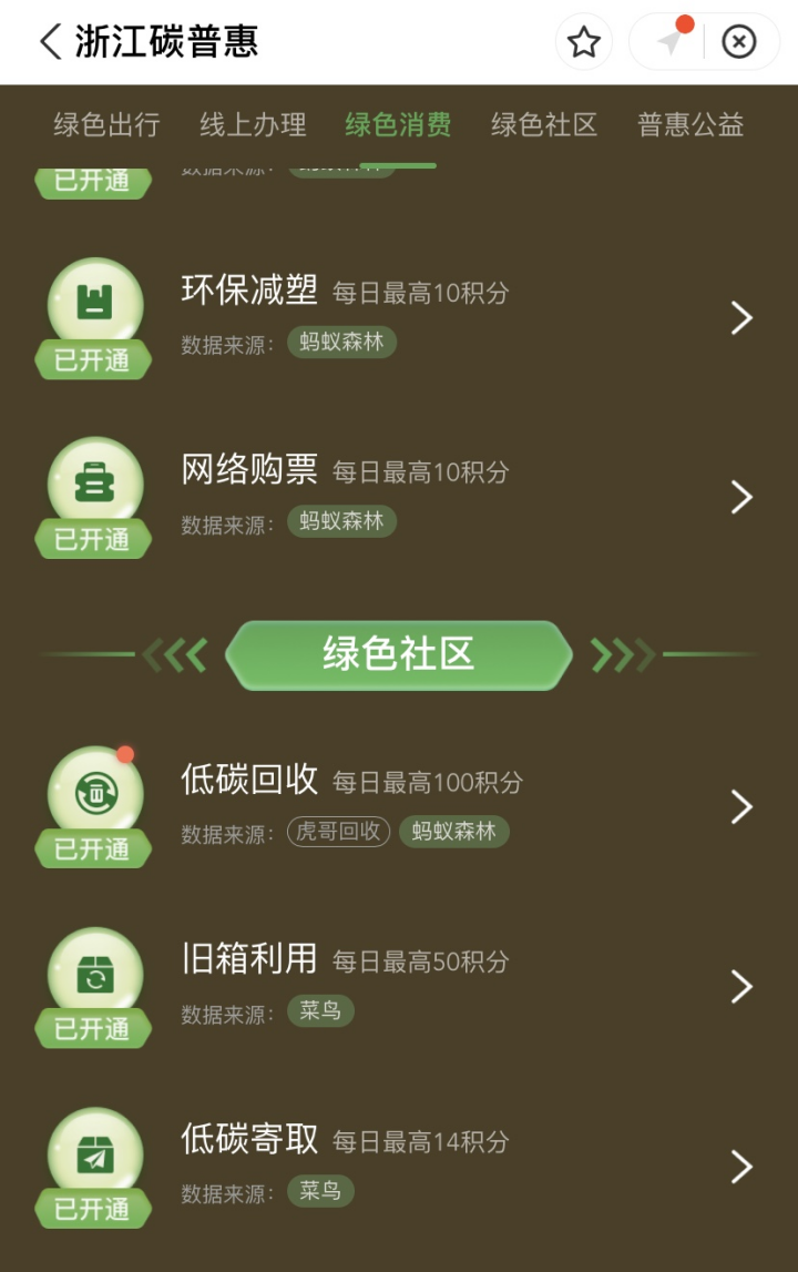 菜鳥接入浙江碳普惠平臺以后,快遞消費者參與菜鳥快遞包裝回收、低碳寄取、舊箱再利用,都可以在浙江碳普惠平臺形成碳積分,獲得上述權益。