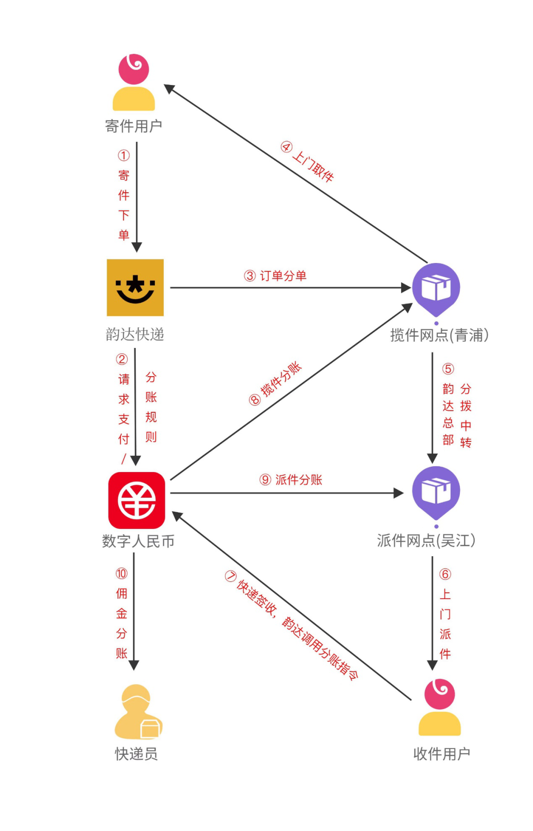 近日,長三角示范區(qū)執(zhí)委會聯(lián)合中國銀行上海市分行及韻達快遞打造了全國首例快遞費用數(shù)字人民幣跨區(qū)域自動分賬場景。眾所周知,傳統(tǒng)快遞業(yè)務支付模式存在大量手續(xù)費用、企業(yè)清分效率底下、多端收款時間滯后等弊端,容易導致攬派件網(wǎng)點及快遞員獲取相應應得收入時間滯后等情況發(fā)生。為破解痛點,長三角示范區(qū)執(zhí)委會攜手中國銀行上海市分行積極對接韻達快遞,結(jié)合數(shù)字人民幣特性,通過智能合約技術,優(yōu)化改造韻達APP系統(tǒng),實現(xiàn)了攬派件網(wǎng)點和快遞員收入的實時分賬。
