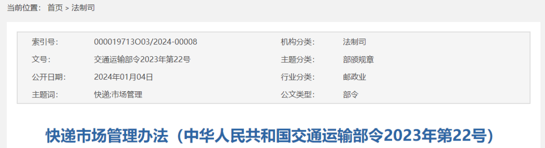 《快遞市場管理辦法》已于2023年12月8日經(jīng)第28次部務(wù)會議通過,現(xiàn)予公布,自2024年3月1日起施行。