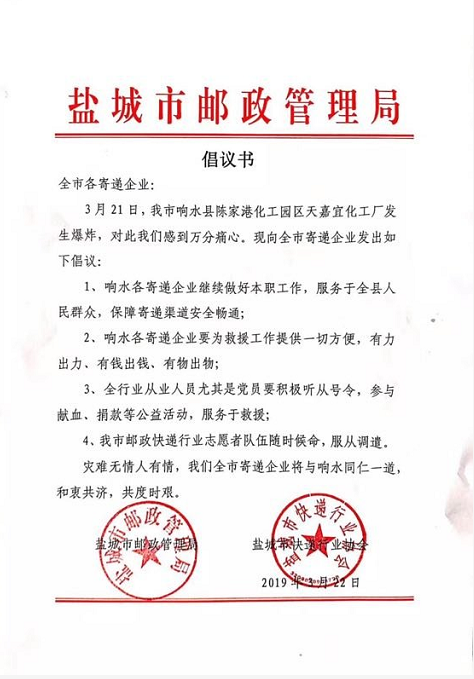 一方有難,八方支援。3月22日,鹽城市郵政管理局和鹽城市快遞行業(yè)協(xié)會向當(dāng)?shù)匕l(fā)出倡議書,號召寄遞保障寄遞渠道安全暢通,積極參與救援工作。