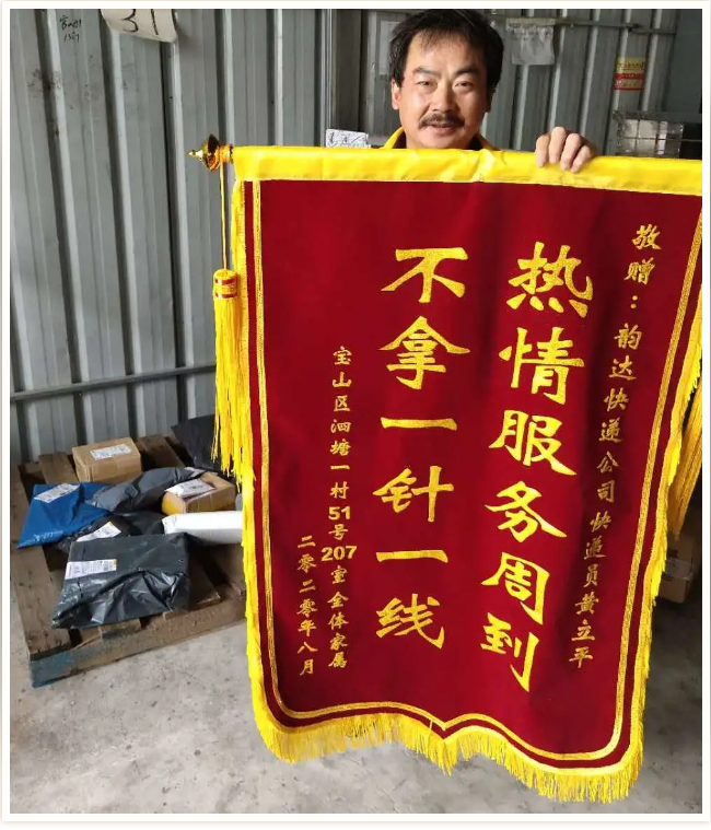 為了表達(dá)對(duì)黃立平的感謝,老人8月份多次給他小費(fèi),黃立平堅(jiān)決不肯要,他向老人解釋?zhuān)骸斑@是我們每一位韻達(dá)快遞員的本職工作,我只是做好了自己應(yīng)該做的事情,客戶(hù)的獎(jiǎng)勵(lì)是萬(wàn)萬(wàn)不能要的。”老人很感激也很敬佩黃立平的工作態(tài)度和服務(wù)精神,出院后立馬專(zhuān)程來(lái)到了韻達(dá)上海寶山共江網(wǎng)點(diǎn),給黃立平送上了一面錦旗。