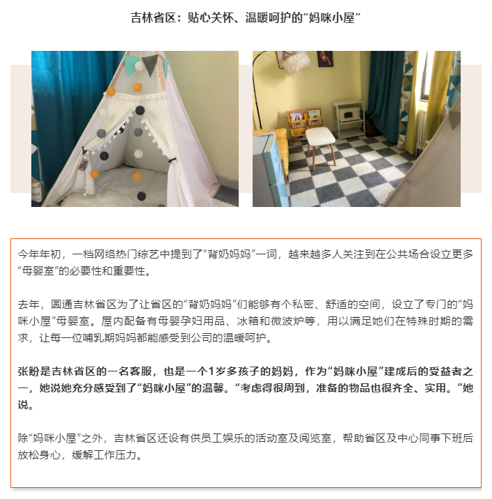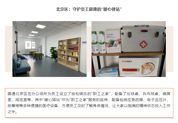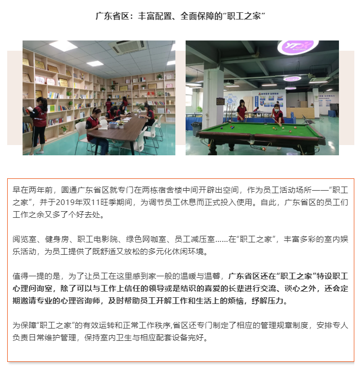 人是企業(yè)最寶貴的資源。如今,在圓通總部及全國各地省區(qū),上百平米的員工活動室、貼心人性化的母嬰室、藏書千余本的職工閱覽室、配備齊全的健身娛樂室,一應俱全,面面俱到……圓通始終堅持以人為本,持續(xù)創(chuàng)新、豐富形式,關心、關懷快遞小哥等在內的快遞一線員工。